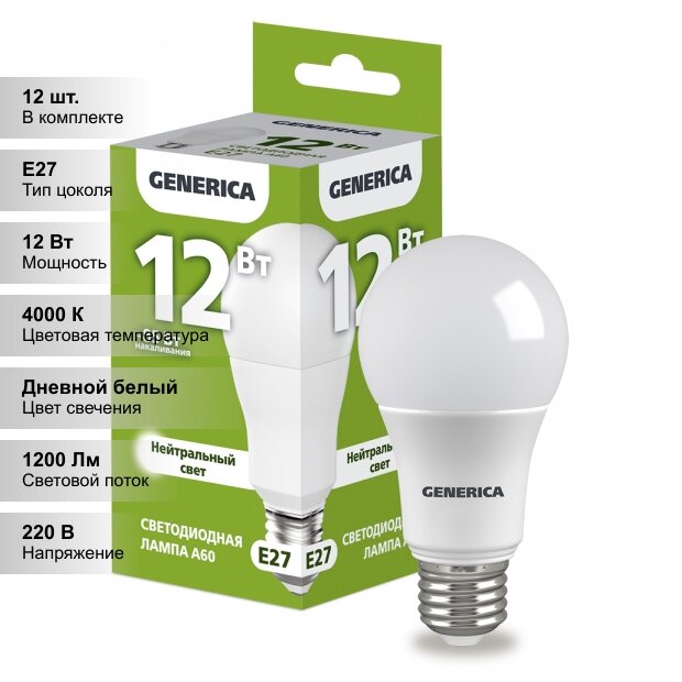 GENERICA Лампа светодиодная GENERICA A60, 12 Вт, груша, 4000 К, E27, 230 В, LL-A60-12-230-40-E27-G