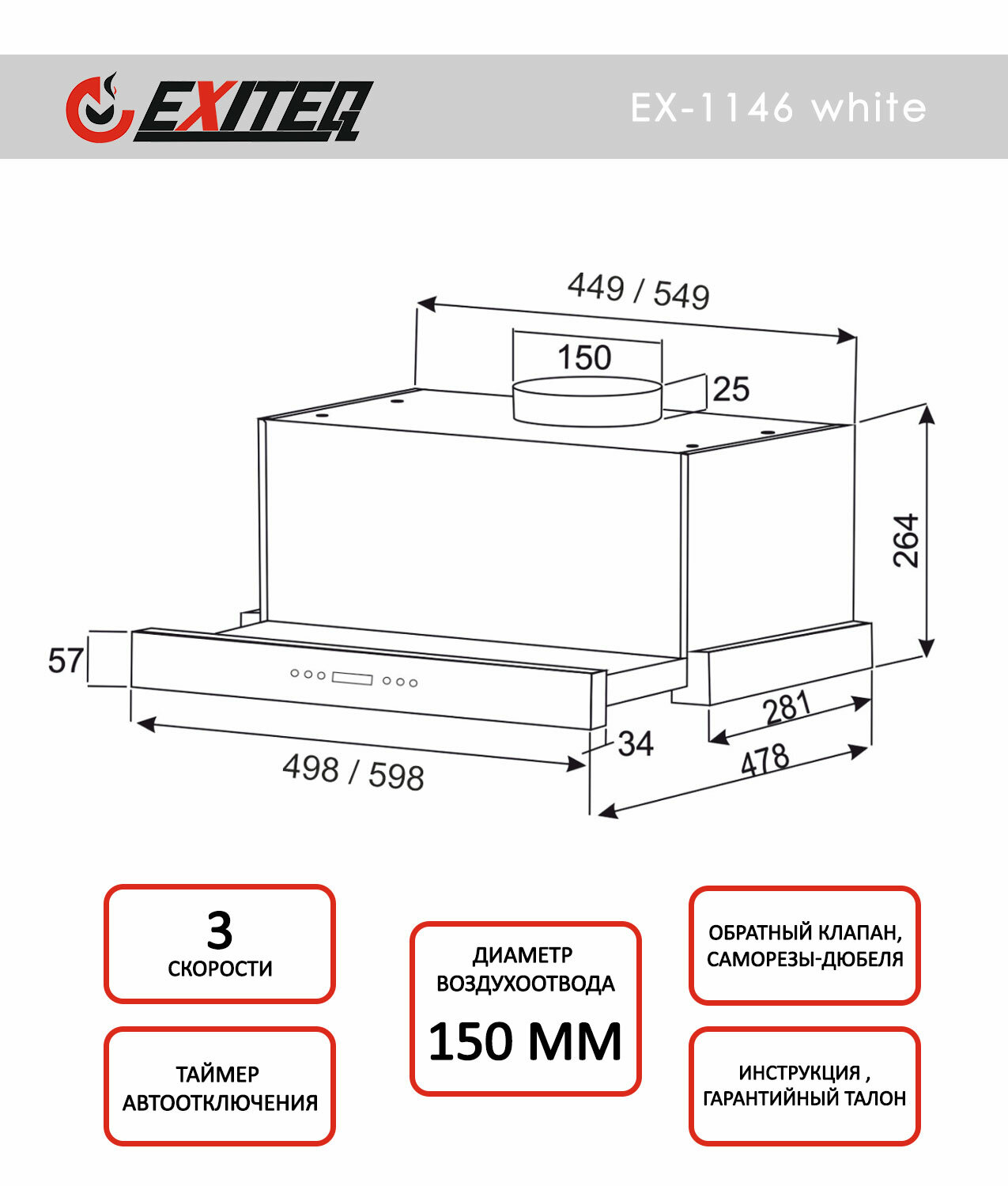 Встраиваемая кухонная вытяжка EXITEQ EX-1146 WHITE информация: