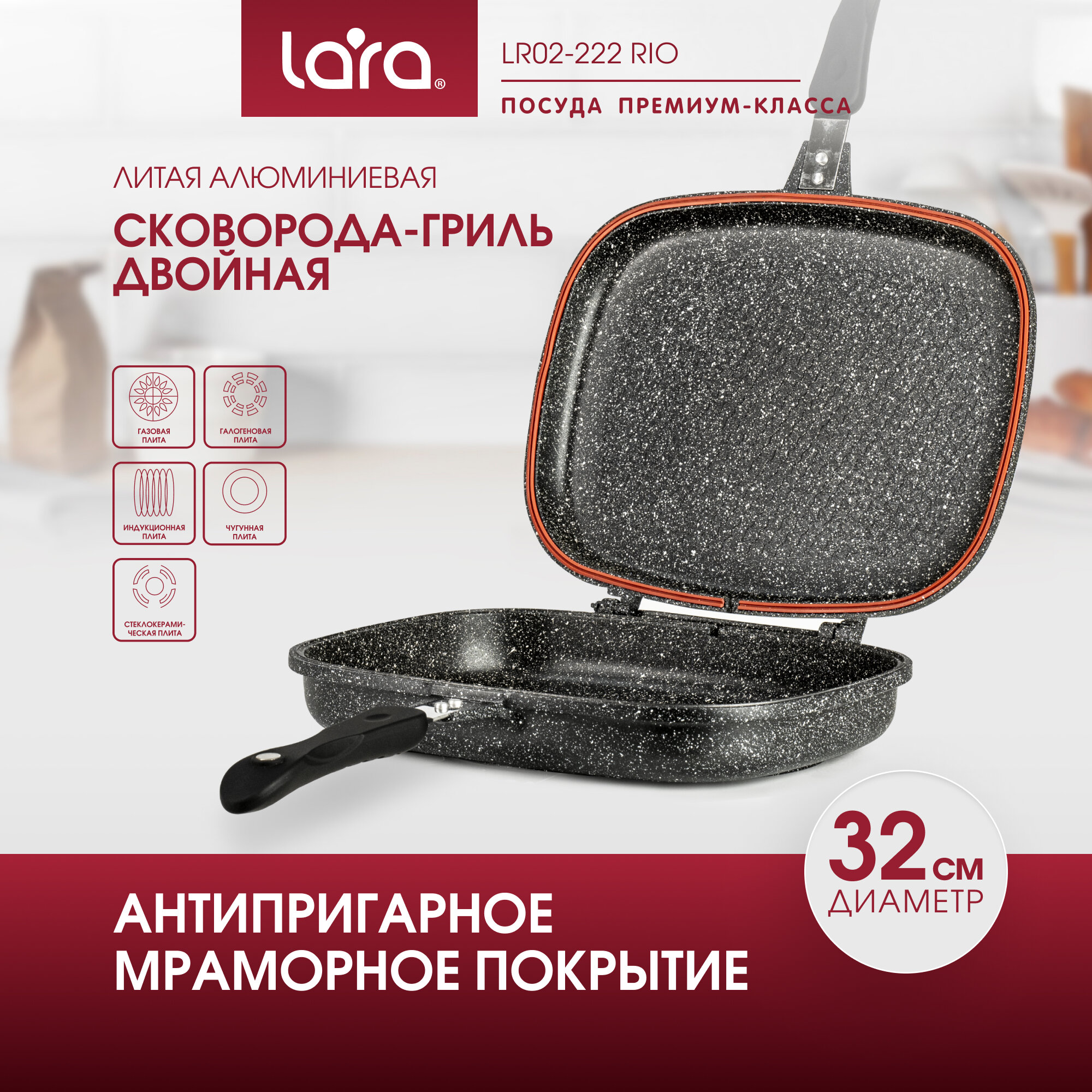 LR02-222 Сковорода-гриль LARA серия Rio 32см, двойная, мрамор, капсулированное индукционное дно