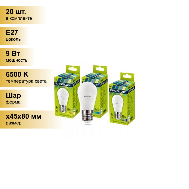 10 цен на (20 шт.) Светодиодная лампочка Ergolux шар G45 E27 9W(800lm 220°) 6500K 6K матовая 88x45 пластик/алюм. LED-G45-9W-E27-6K . Цоколь E27