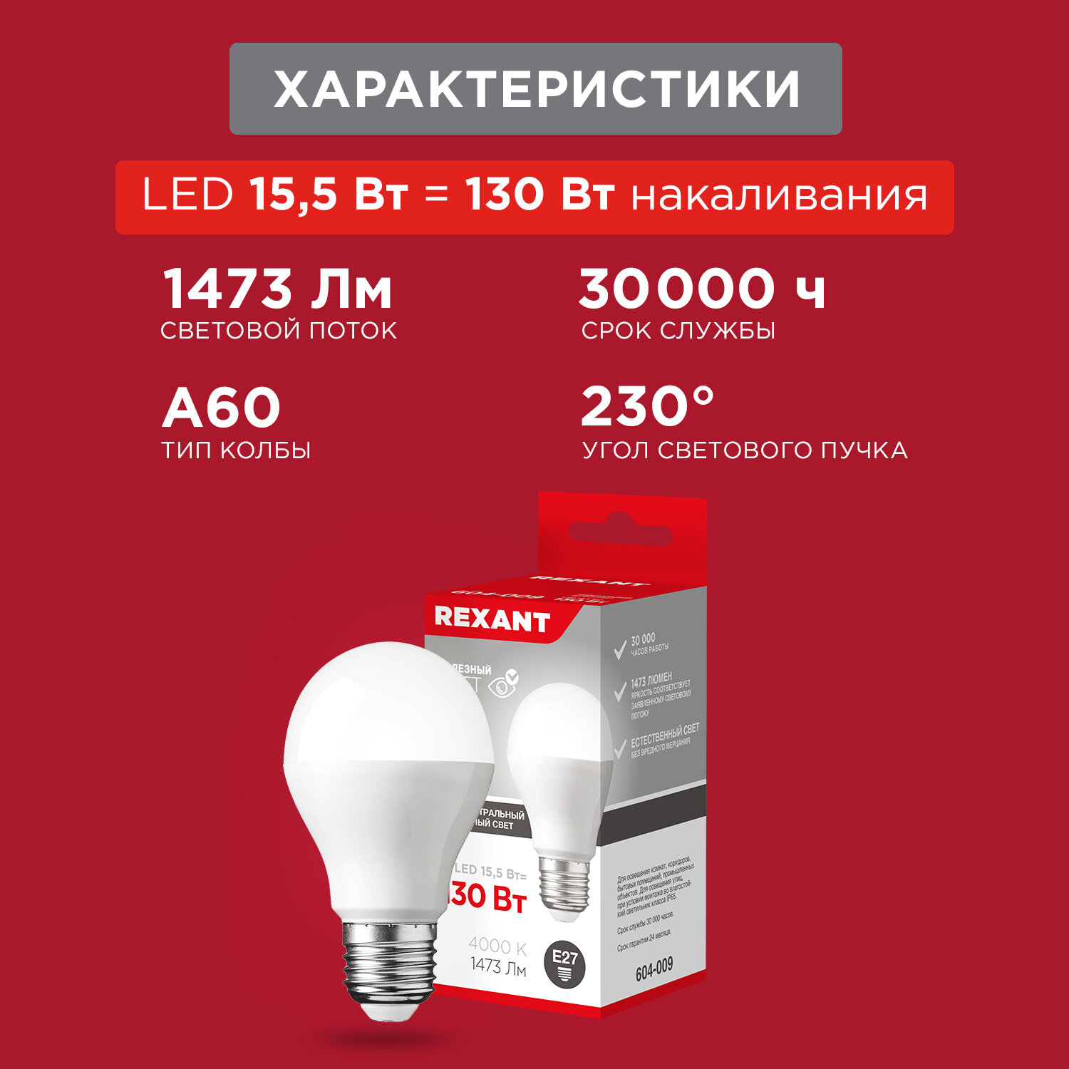 Лампа светодиодная 15.5Вт A60 грушевидная 4000К нейтр. бел. E27 1473лм, REXANT 604-009 (1 шт.)