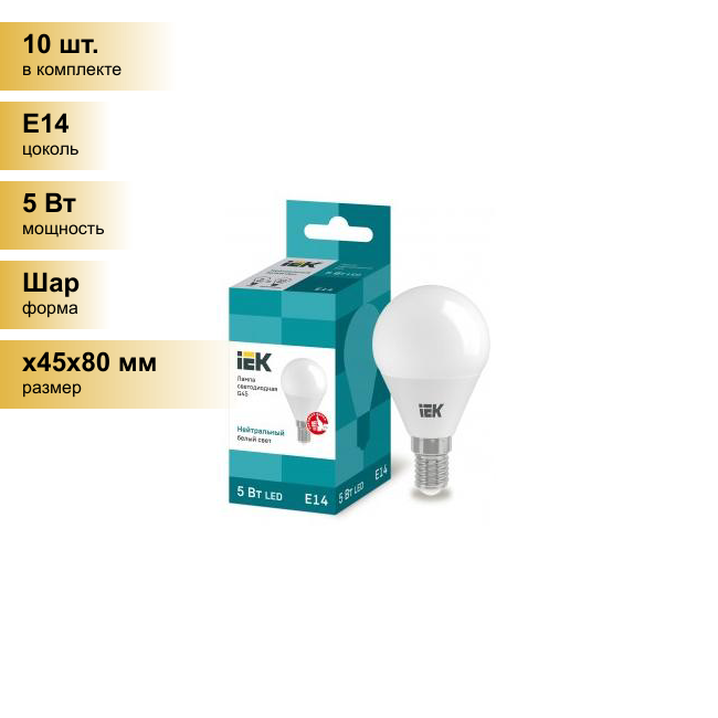 Отзывы на (10 шт.) Светодиодная лампочка IEK шар G45 E14 5W(450lm) 4000K 4K 78x45 матов. ECO LLE-G45-5-230-40-E14 . Цоколь E14