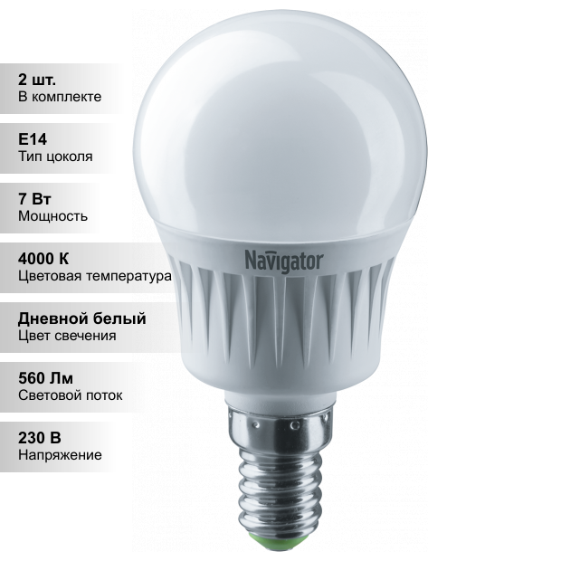 (2 шт.) Светодиодная лампочка Navigator G45 7Вт 230В 4000K E14 информация: