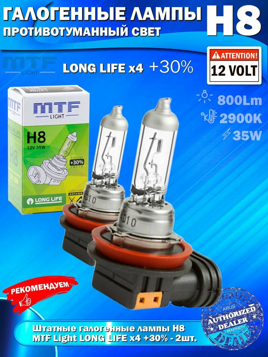 10 цен на Галогенные лампы MTF Light H8, 12V, 35W, +30% LONG LIFE x4, 2шт.