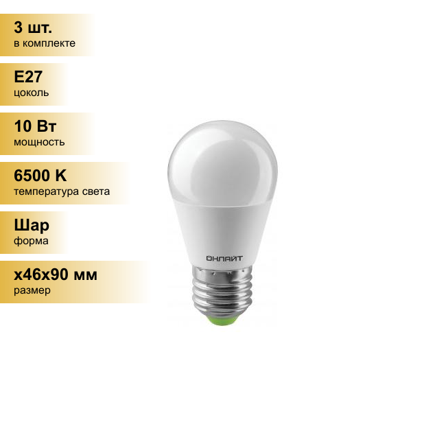 (3 шт.) Светодиодная лампочка онлайт шар G45 E27 10W(800lm)6500K6K90х46 OLL-G45-10-230-6.5K-E27 61970 . Цоколь E27 информация: