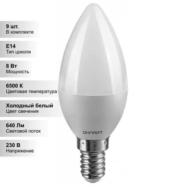 (9 шт.) Светодиодная лампочка онлайт C37 8Вт 230В 6500K E14 информация: