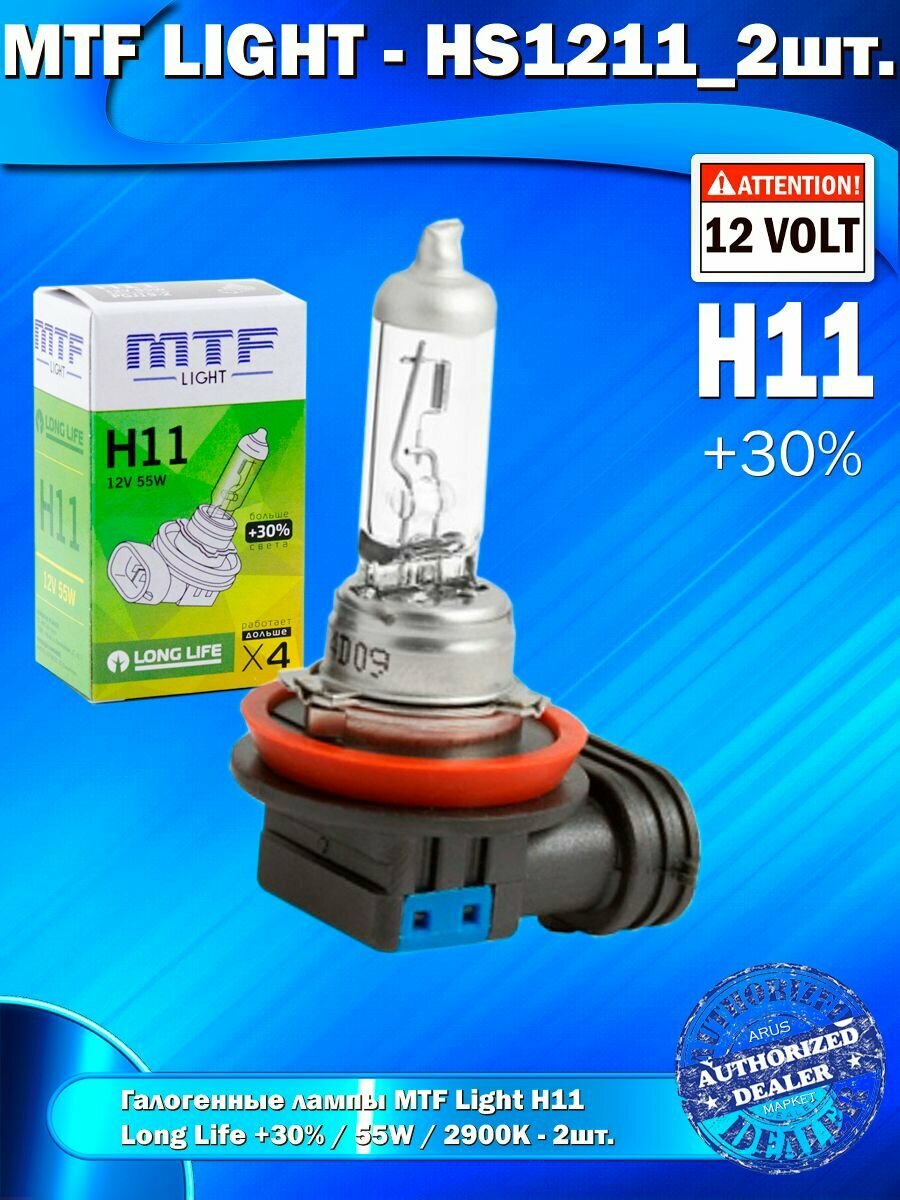 10 цен на Галогенные лампы MTF Light H11, 12V, 55W, +30% LONG LIFE x4, 2шт.