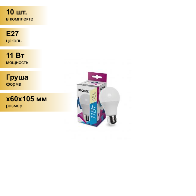 (10 шт.) Светодиодная лампочка Космос ЛОН A60 E27 11W (870lm) 3000K 2K матов. 108x60 LkecLED11wA60E2730 8571 . Цоколь E27 информация: