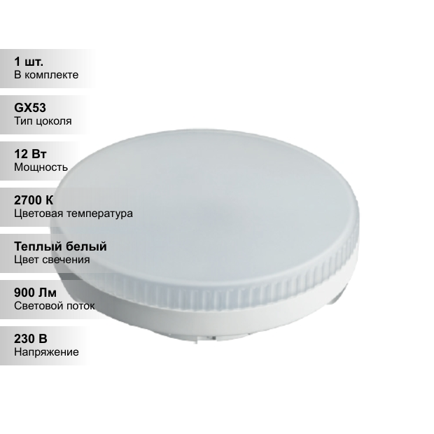 Лампа светодиодная онлайт 12Вт GX53 2700К 230В цилиндр GХ53 информация:
