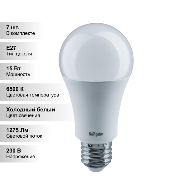 (7 шт.) Светодиодная лампочка Navigator A60 15Вт 230В 6500K E27 размер 60x128 информация: