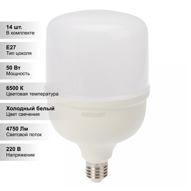 (14 шт.) Лампа светодиодная высокомощная 50 Вт E27 с переходником на E40 4750 лм 6500 K холодный свет REXANT 604-071 информация:
