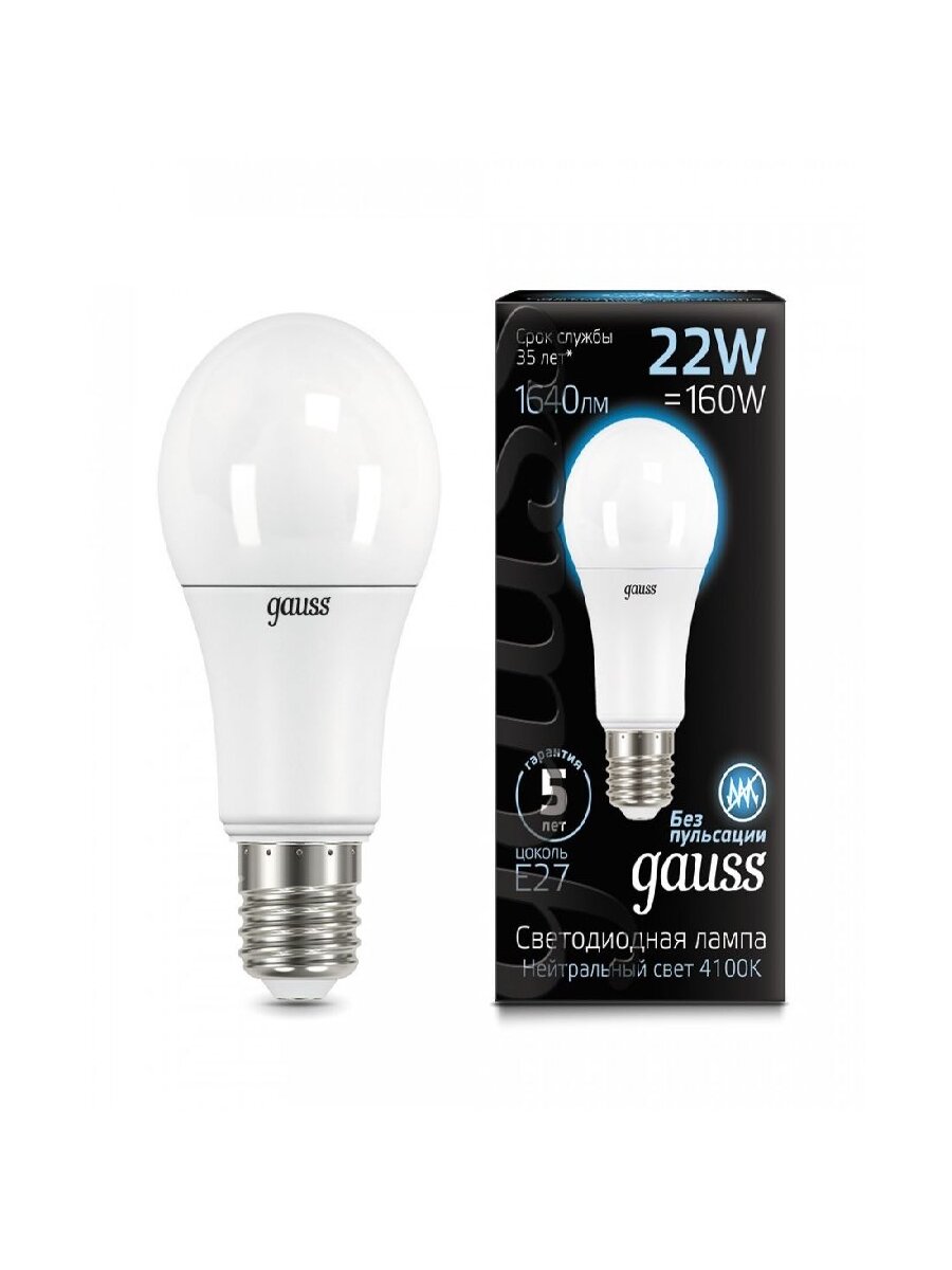 (5 шт.) Светодиодная лампочка Gauss ЛОН A70 E27 22W(1640lm) 4100 4K 135x70 матовая, пластик/алюм. 102502222 Нейтральный белый. Цоколь E27 3 925 ₽