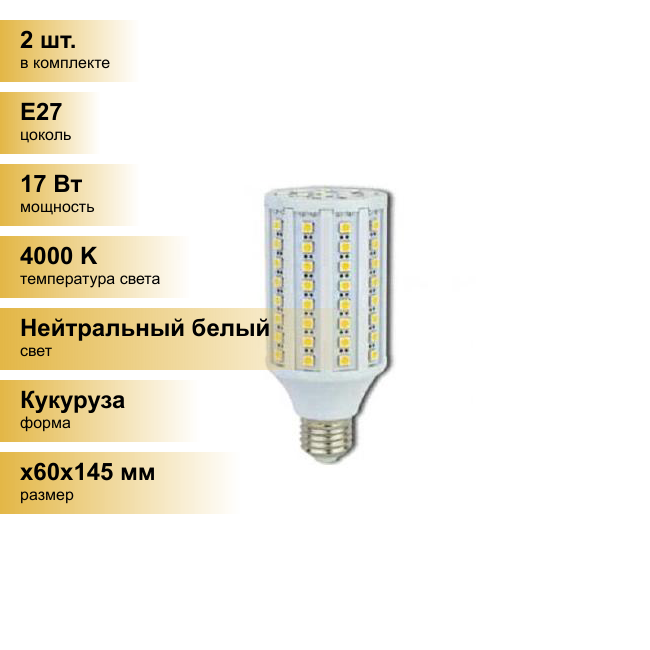 (2 шт.) Светодиодная лампочка Ecola кукуруза E27 17W 4000K 4K 145x60 96LED Premium Z7NV17ELC Нейтральный белый. Цоколь E27 информация: