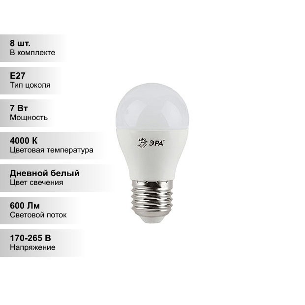 (8 шт.) Светодиодная лампочка ЭРА P45 7Вт 170-265В 4000К Е27 информация: