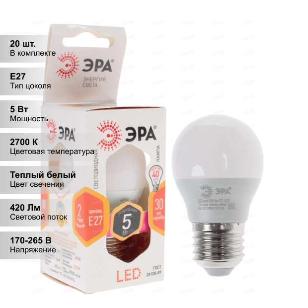 (20 шт.) Светодиодная лампочка ЭРА P45 5Вт 170-265В 2700К E27 информация: