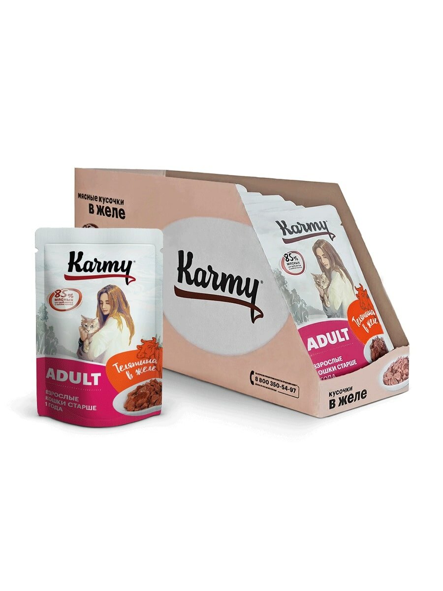 10 цен на Karmy Adult пауч для взрослых кошек (кусочки в желе) Телятина, 80 г. упаковка 12 шт