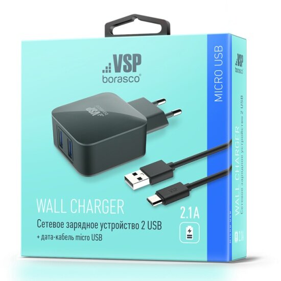 BORASCO Сетевое зарядное устройство BoraSCO 2 USB 2.1A + кабель micro USB Черный