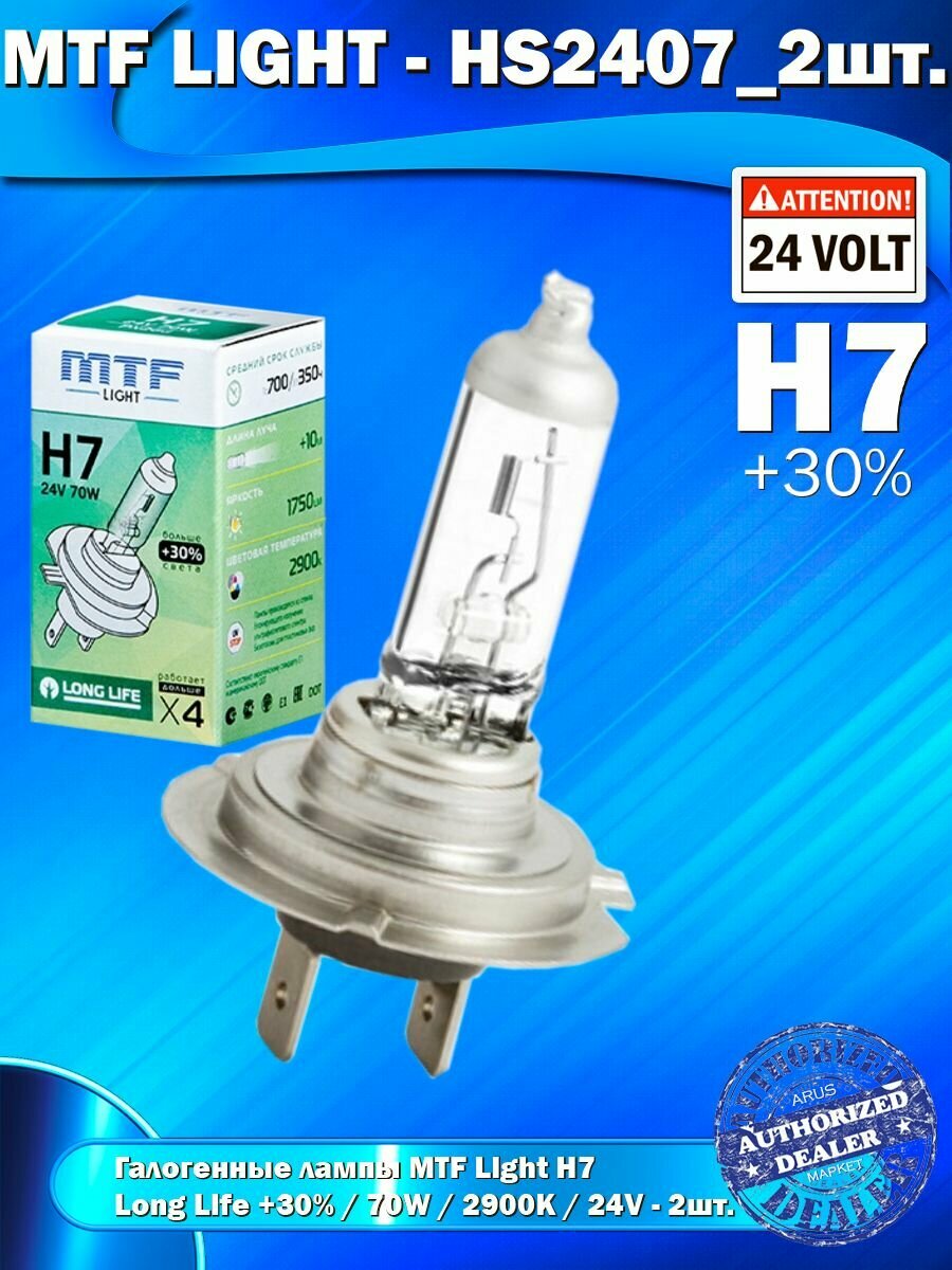 Галогенные лампы MTF Light H7, 24V, 70W, +30% LONG LIFE x4, 2шт. информация: