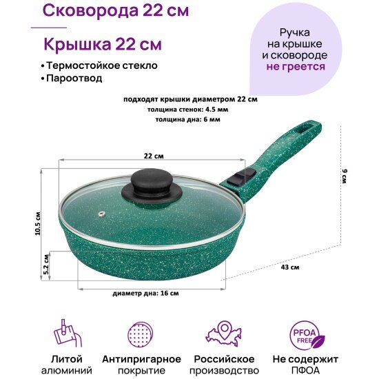 Сковорода глубокая Elan Gallery Гармония вкуса "Изумруд" с крышкой, со съёмной ручкой, 22 см информация: