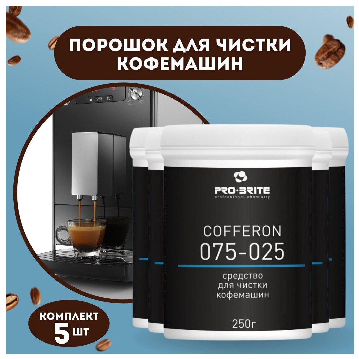 Чистящее средство для кофемашин и кофеварок 250 г, комплект 5 шт., PRO-BRITE COFFERON, порошок, банка, 075-025 3 227 ₽
