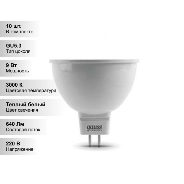 (10 шт.) Светодиодная лампочка Gauss MR16 9Вт 220В 2700K-3000К GU5.3 информация: