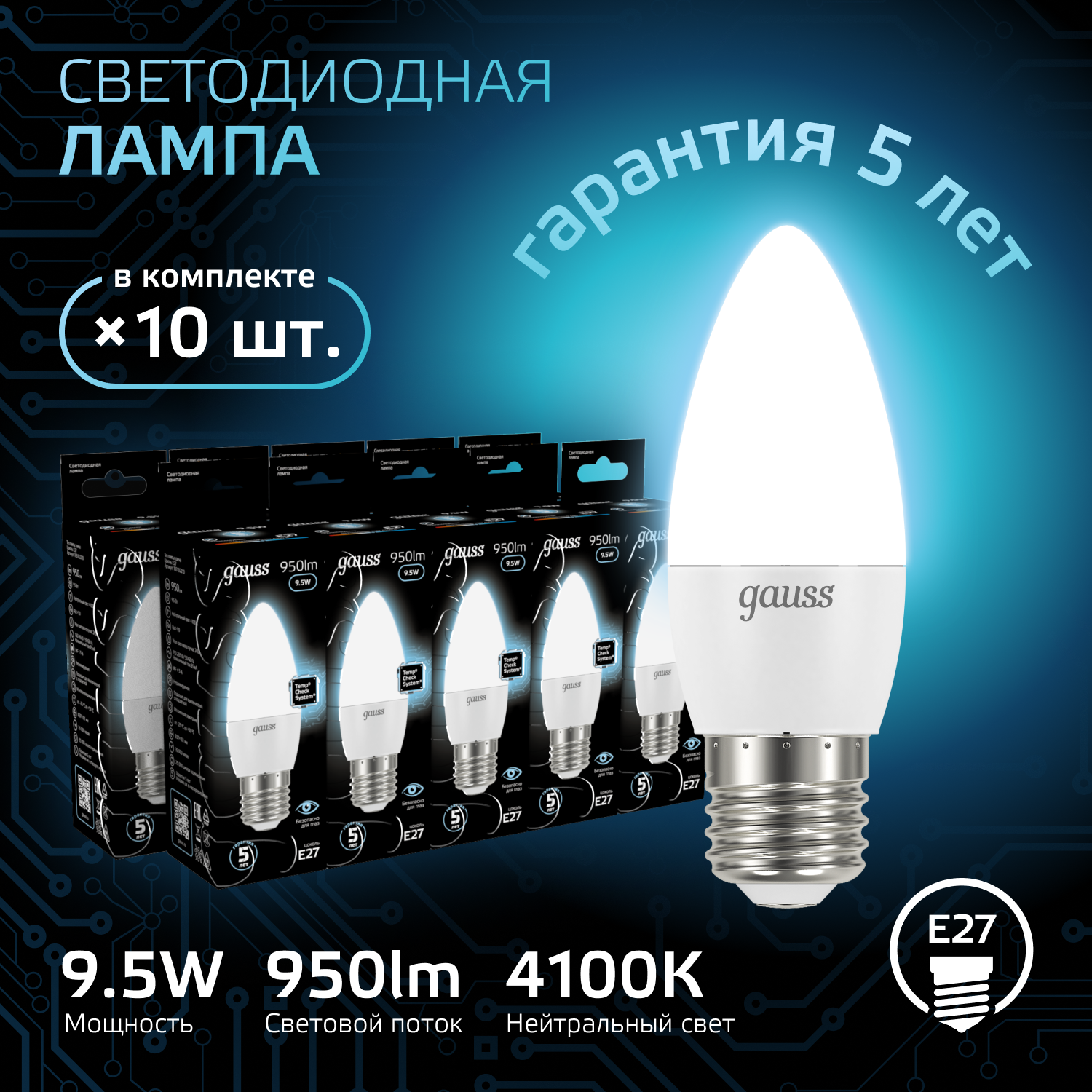 Лампочка светодиодная Е27 Свеча 9.5W нейтр белый свет 4100К упаковка 10 шт. Gauss информация: