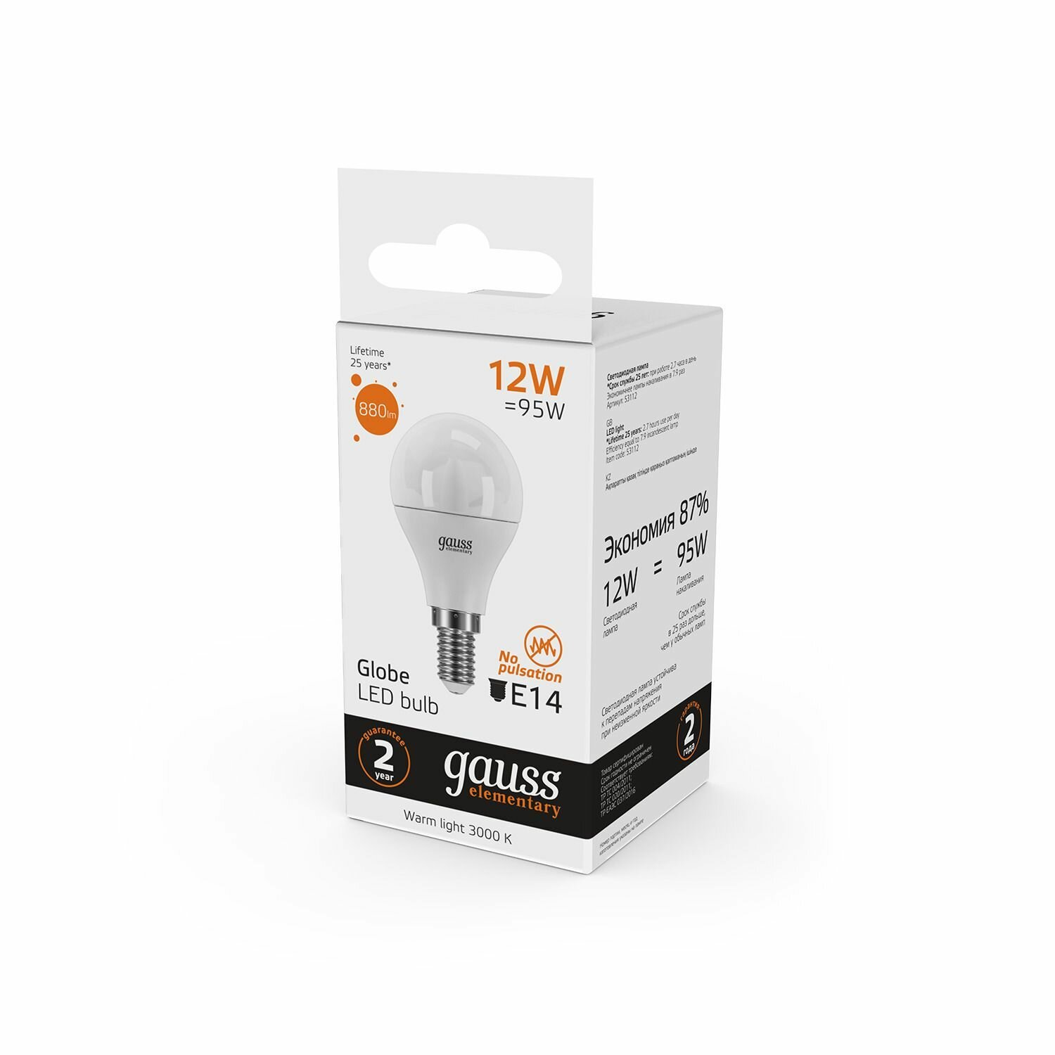 Лампа светодиодная Elementary 12Вт шар 3000К тепл. бел. E14 880лм GAUSS 53112