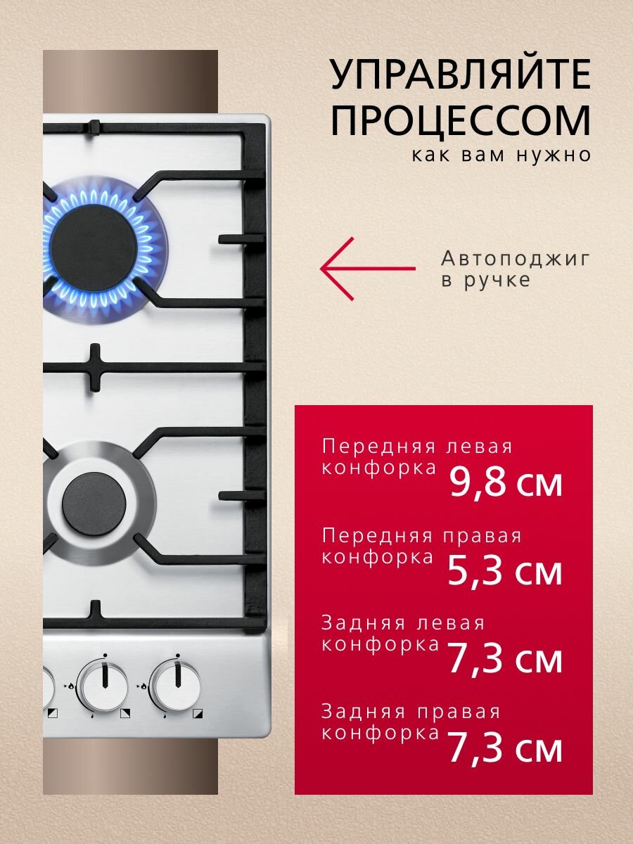 | Размеры конфорок | передняя левая конфорка 9,8 см, задняя левая конфорка 7,3 см, передняя правая конфорка 5,3 см, задняя правая конфорка 7,3 см |