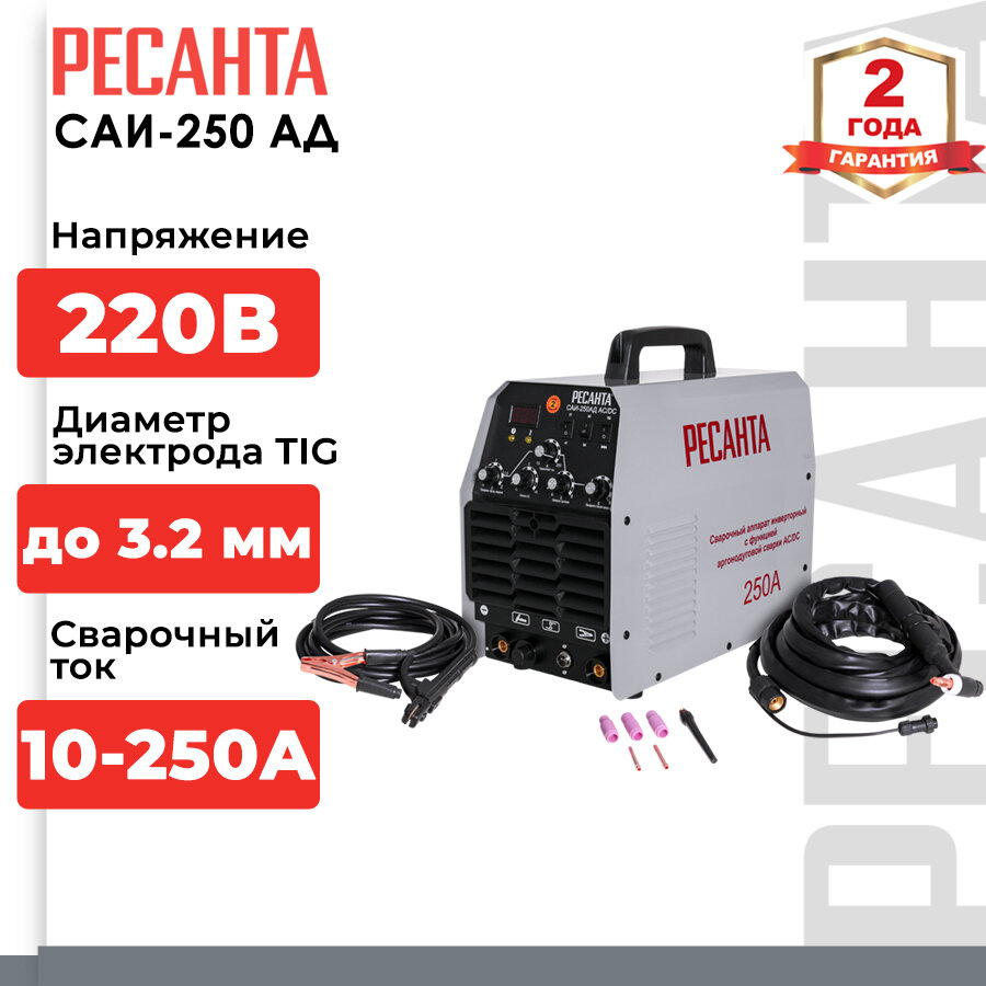 Сварочный аппарат инверторный САИ- 250АД AC/DC Ресанта, MMA, TIG, 220±15% В, 15–250 А 63 664 ₽