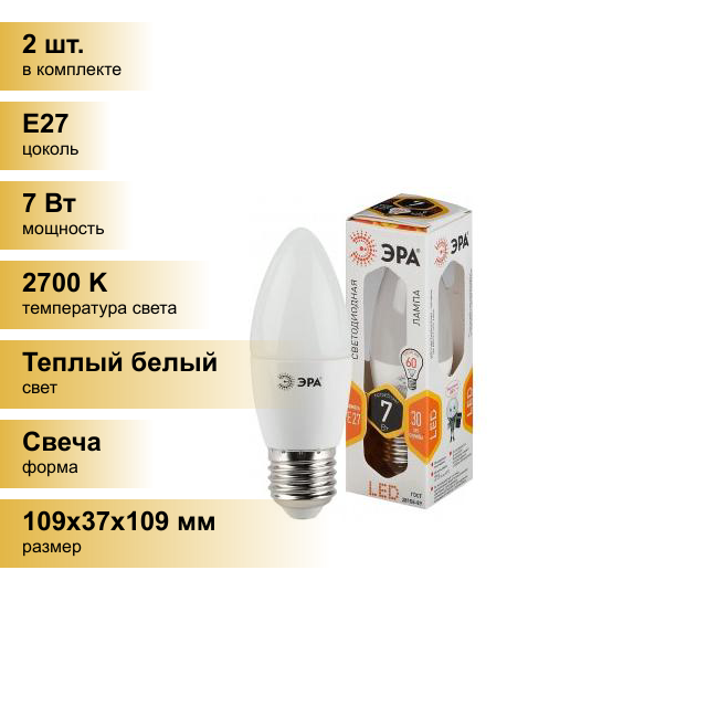 Отзывы на (2 шт.) Светодиодная лампочка ЭРА стандарт свеча B35 E27 7W(560lm) 2700K 2K 109x37 B35-7w-827-E27 4670 Теплый белый. Цоколь E27