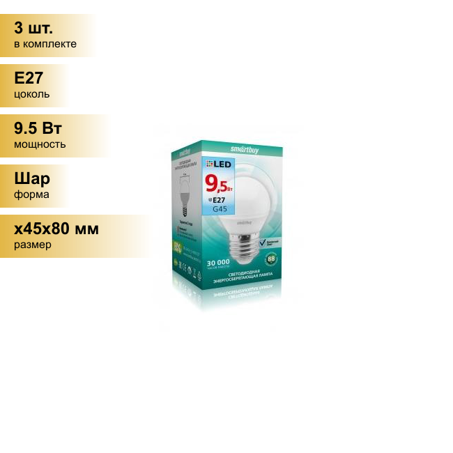 (3 шт.) Светодиодная лампочка Smartbuy шар G45 E27 9.5W 4000K 4K матовая пластик SBL-G45-9_5-40K-E27 . Цоколь E27 информация: