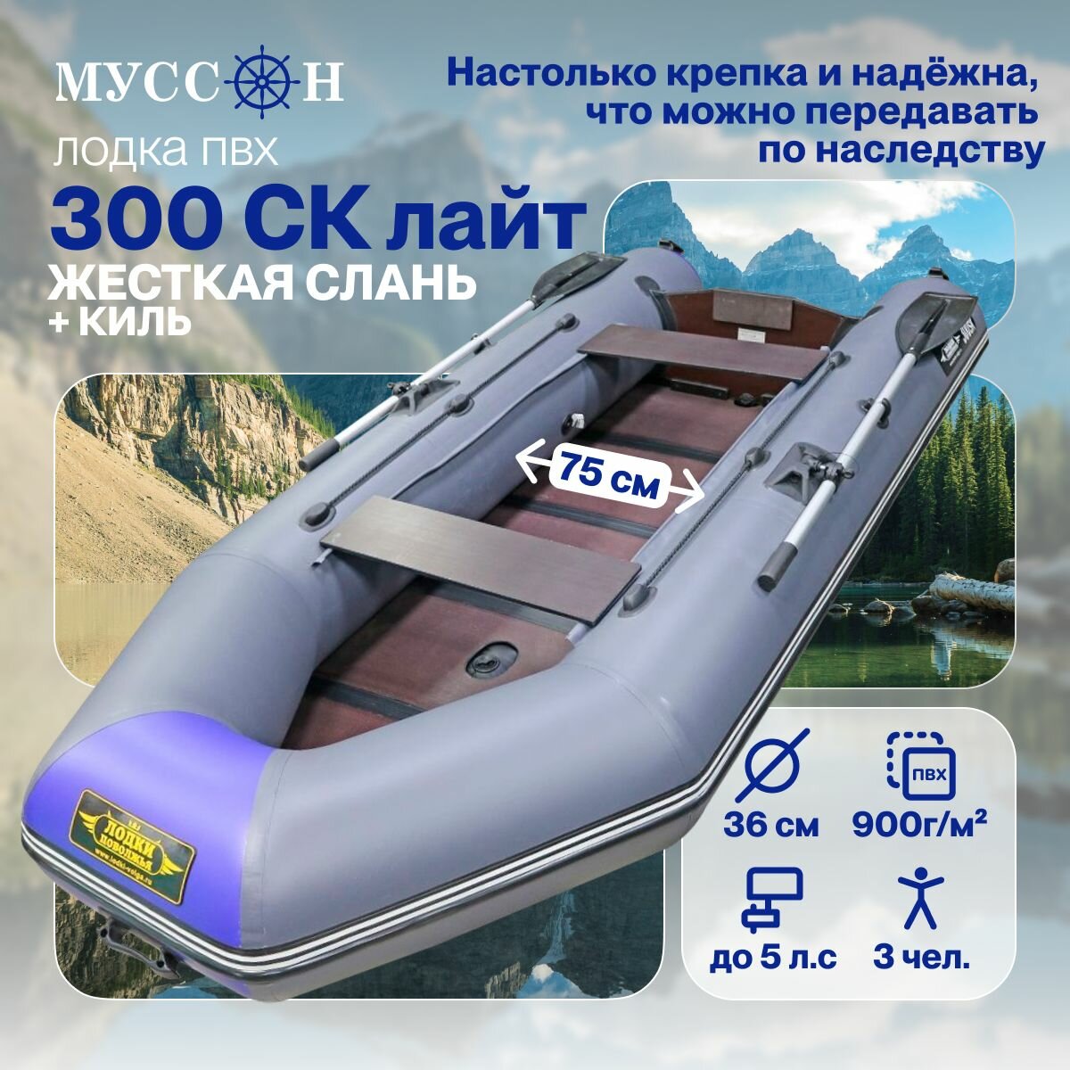 Лодка ПВХ под мотор надувная Муссон 300 СК Лайт с жёстким полом и килем для рыбалки, серо-синяя 48 630 ₽