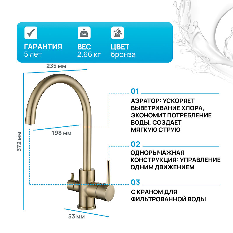 Смеситель для кухни с фильтром для питьевой воды KAISER Mercur 26744-3, цвет бронза