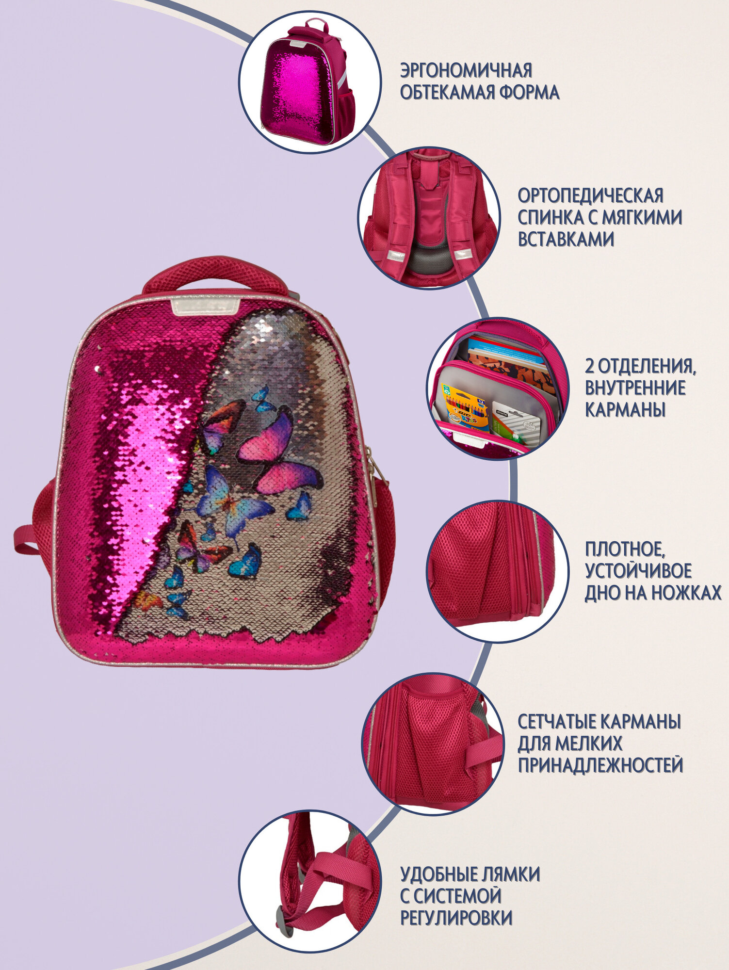 Ранец Basic Sparkle Pink,эргоном. спинка, двустор.пайетки фуксия/серебро