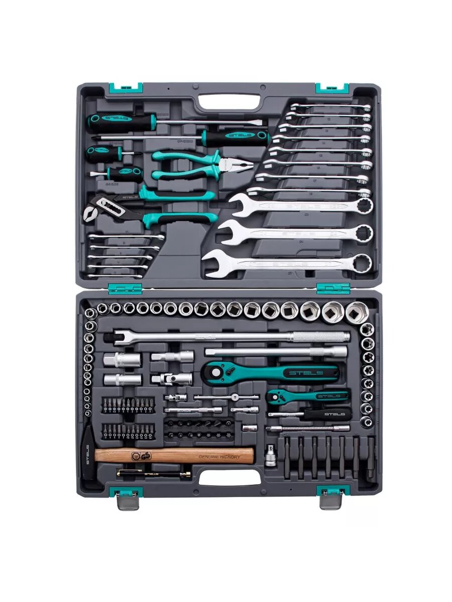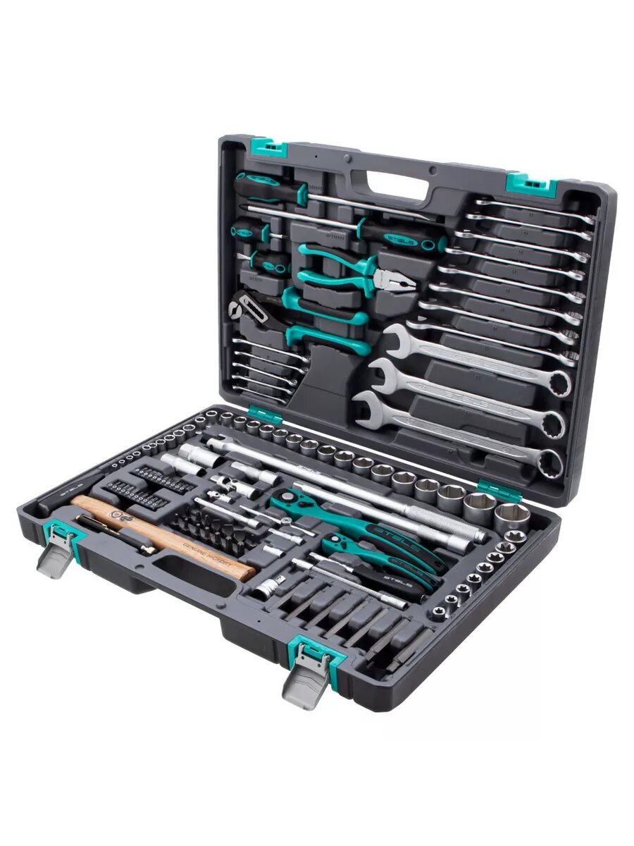 10 цен на Универсальный Stels Набор инструментов, 1/4", 1/2", Cr-V, S2, усиленный кейс, 119 предм., 14112