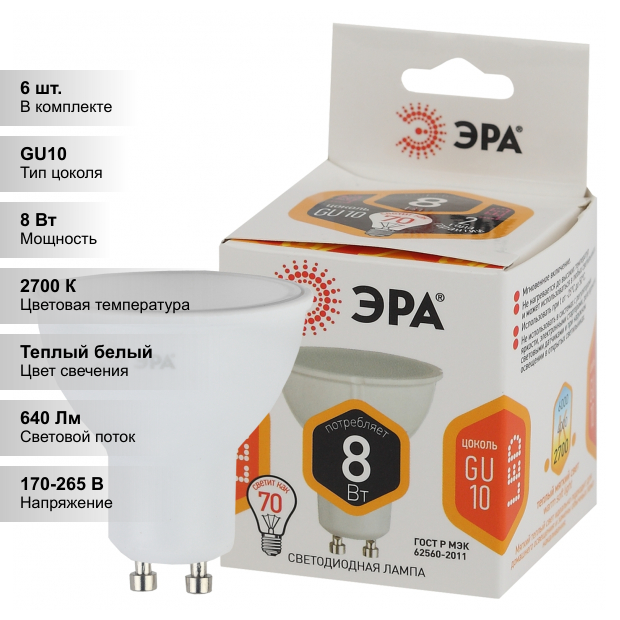 Отзывы на (6 шт.) Светодиодная лампочка ЭРА MR16 8Вт 170-265В 2700К GU10