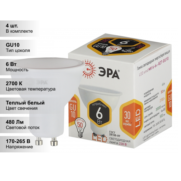 (4 шт.) Светодиодная лампочка ЭРА LED smd MR16-6Вт-827-GU10 информация:
