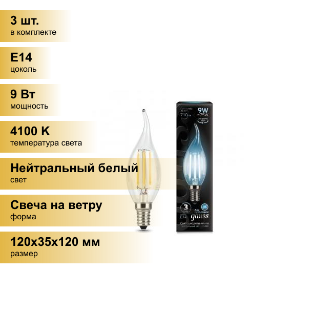 (3 шт.) Светодиодная лампочка Gauss Filament Свеча на ветру E14 9W(710lm) 4100K 4K прозр. 120x35 филамент (нитевидная) 104801209 Нейтральный белый. Цоколь E14 информация: