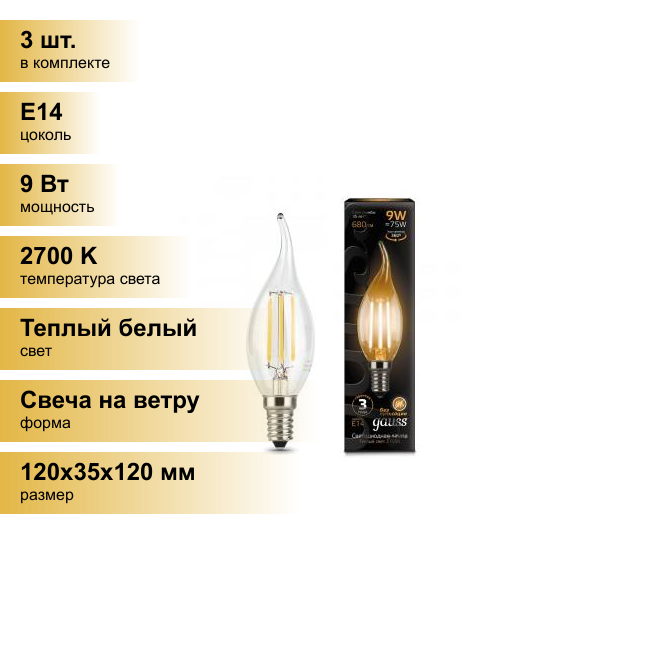 (3 шт.) Светодиодная лампочка Gauss Filament Свеча на ветру E14 9W(680lm) 2700K 2K прозр. 120x35 филамент (нитевидная) 104801109 Теплый белый. Цоколь E14 информация:
