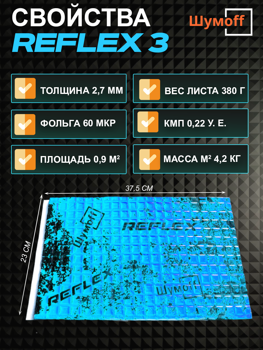 Виброизоляция для автомобиля Шумофф Reflex 3 - 10 листов 37.5 см х 23 см Вибродемпфер для пола, дверей, капота, багажника - толщина 2.7 мм 839 ₽