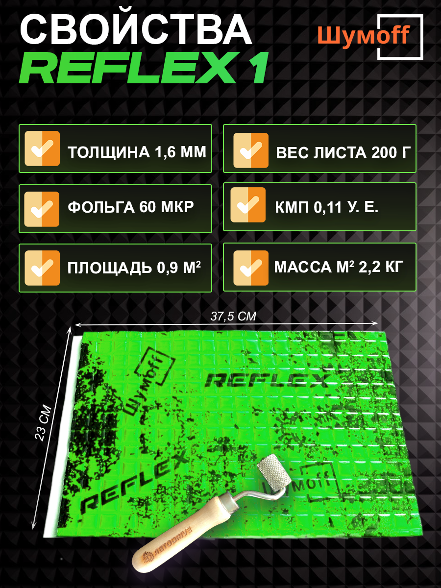 Виброизоляция авто Шумофф Рефлекс 1 - 30 листов + ролик прикаточный. Шумоизоляция для автомобиля, шумка в авто, вибропласт, вибродемпфер. Шумоизоляция для дверей, крыши, потолка, арок, пола, багажника, канализационных труб, стояка, ванны, раковины информация: