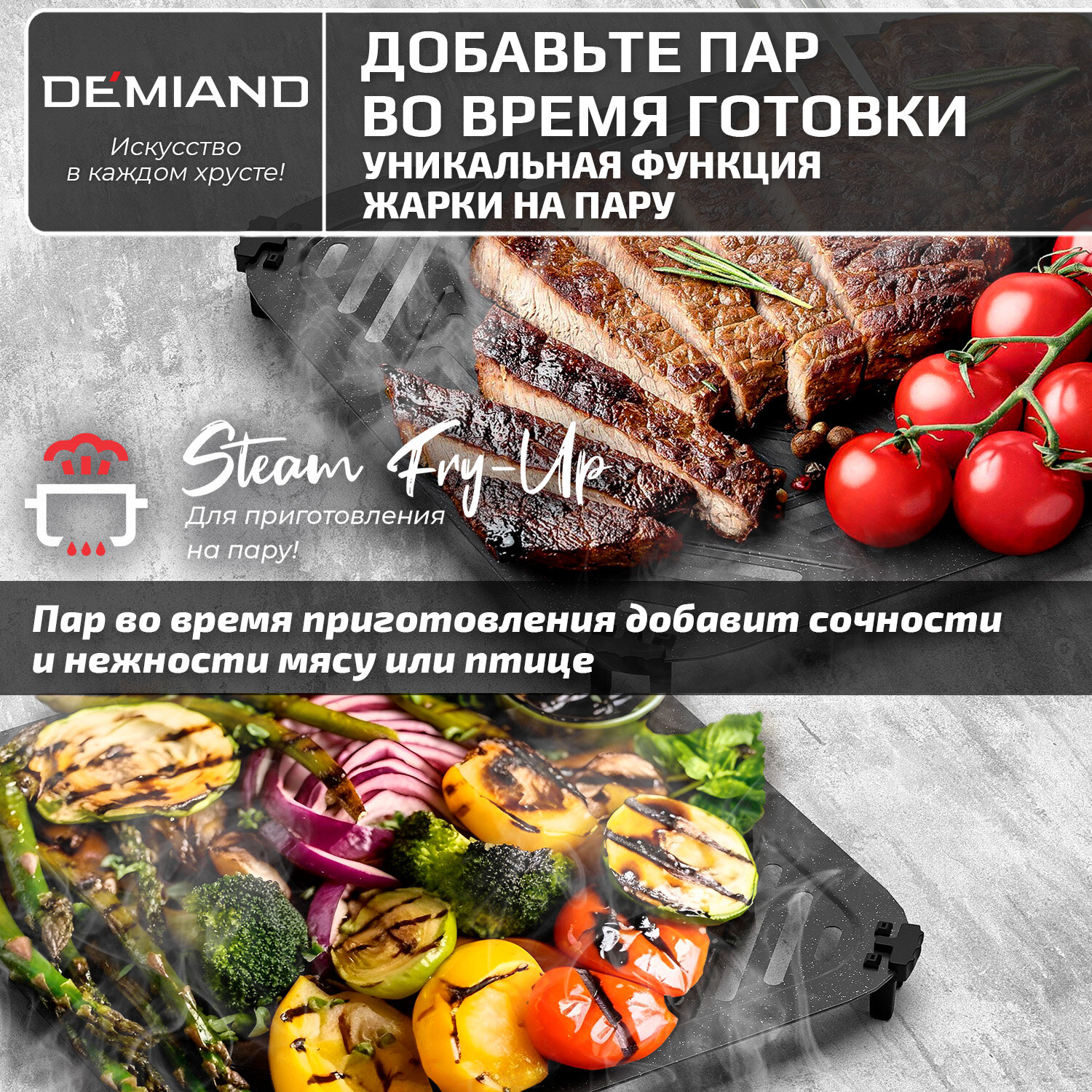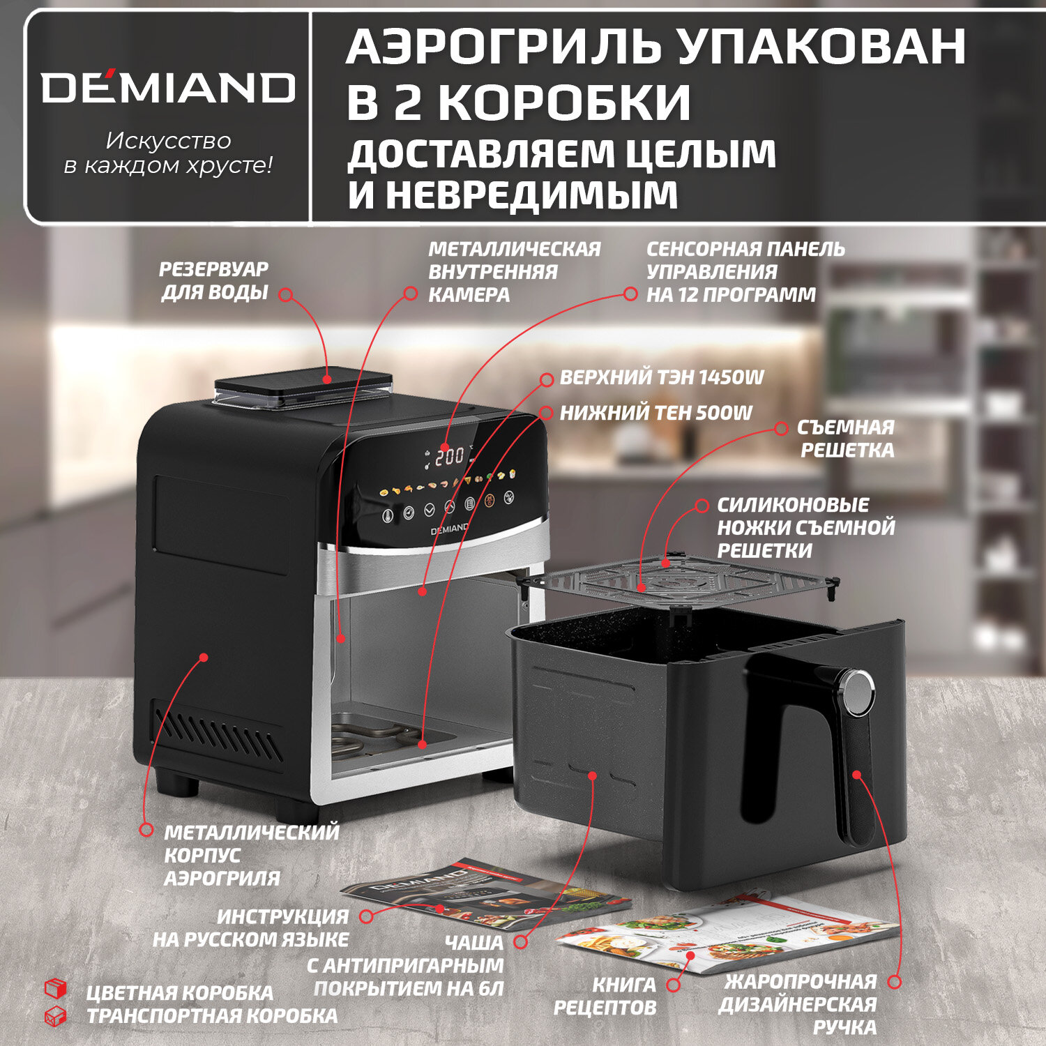 Инновационный аэрогриль Demiand Sanders с уникальной технологией приготовления Жарки на Пару - Steam Fry-Up ,12 программ, визуальное окно, съемная решетка, верхний и нижний тэн, внутренняя камера из стали, объем 6 литров, 1950W, DK-2200, черный информация: