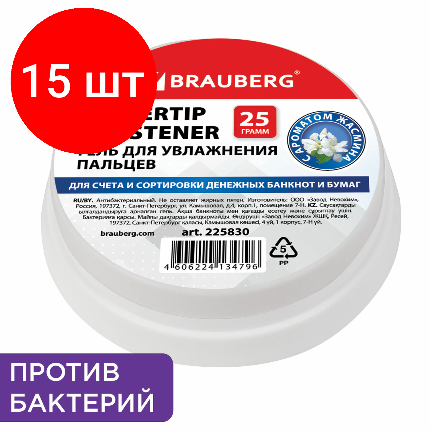 10 цен на Комплект 15 шт, Гель для увлажнения пальцев антибактериальный BRAUBERG 25 г, c ароматом жасмина, голубой, 225830