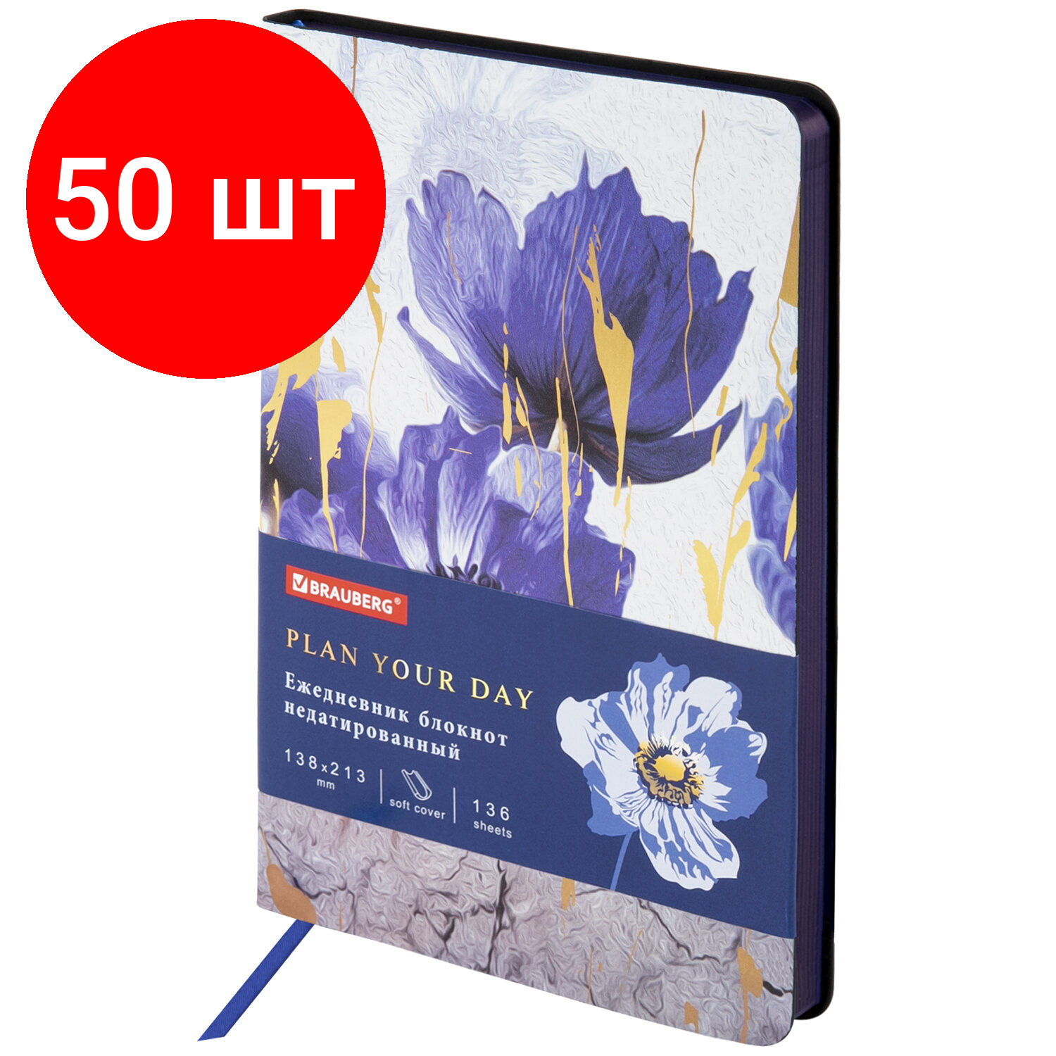 Комплект 50 шт, Ежедневник недатированный А5 (138х213 мм), BRAUBERG VISTA, под кожу, гибкий, 136 л., "Blue flowers", 112013 информация: