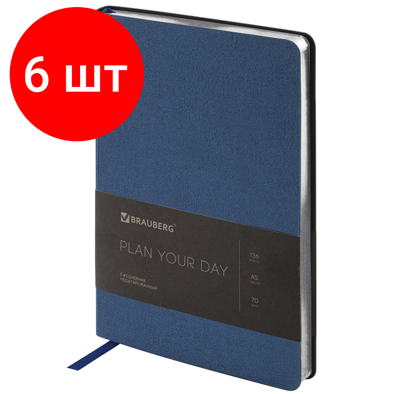 Комплект 6 шт, Ежедневник недатированный А5 138х213мм BRAUBERG Metallic, 136л, гибкий, под кожу, син, 113376 информация: