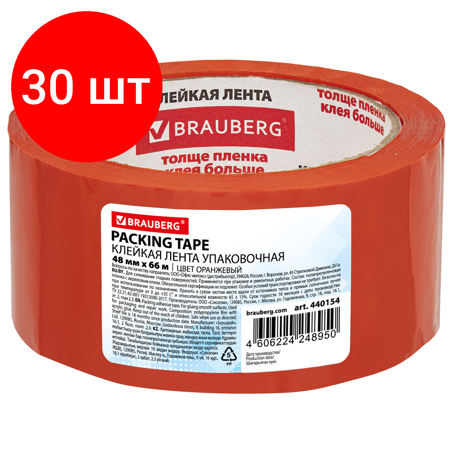 Комплект 30 шт, Клейкая лента упаковочная, 48 мм х 66 м, оранжевая, толщина 45 микрон, BRAUBERG, 440154 информация: