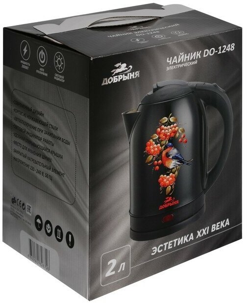 Добрыня Чайник электрический "Добрыня" DO-1248, металл, 2 л, 2000 Вт, чёрный с рисунком "Снегири"
