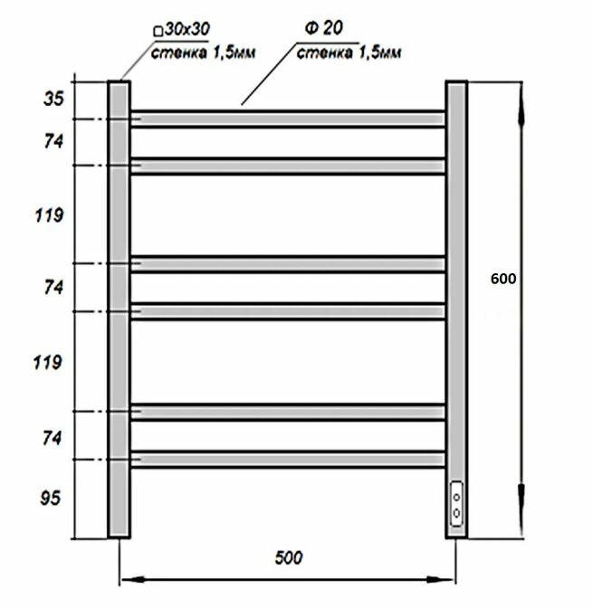 TERMINUS Полотенцесушитель электрический Terminus Хендрикс П6 500x596, ТЭН HT-1 300W, левый/правый