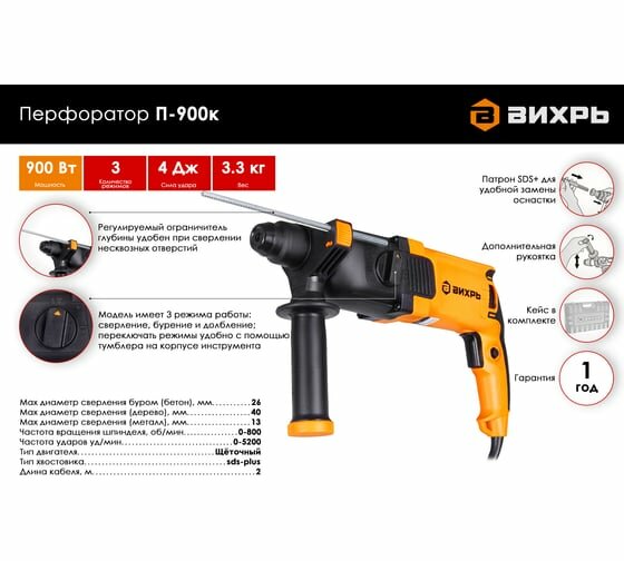 Перфоратор вихрь П-900К 2019, 900 Вт информация:
