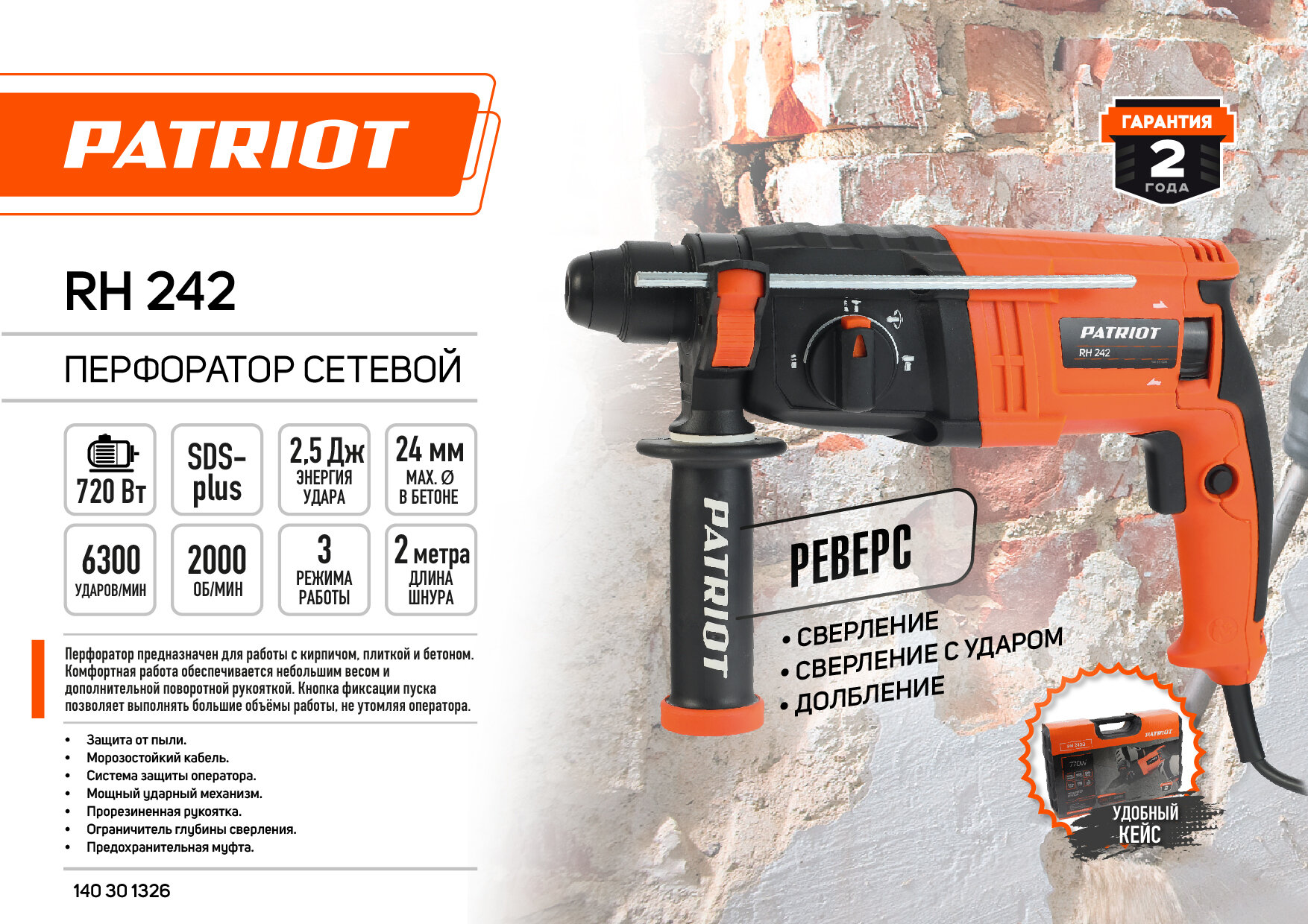 Перфоратор Patriot RH 242 720 Вт, 2,5 Дж,3 режима информация: